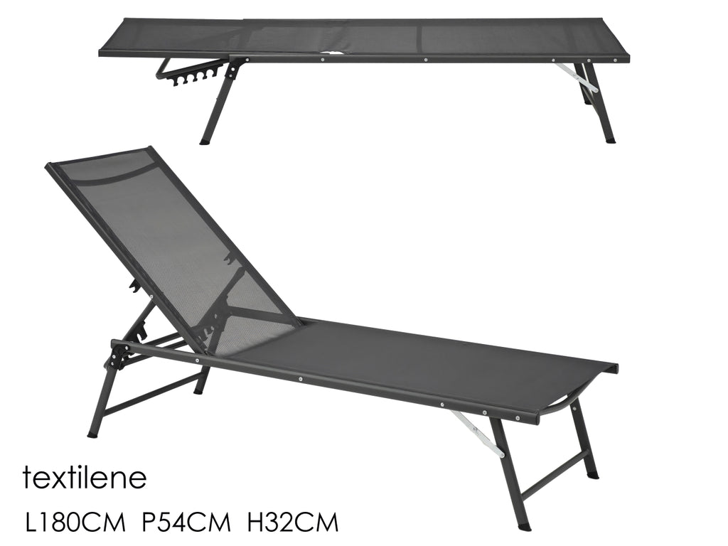 Lettino in textilene con dimensioni di 180 cm di lunghezza, 54 cm di profondità e 32 cm di altezza nel colore antracite. Elegantissimo e adatto per spazi esterni come giardini, terrazze o aree relax.