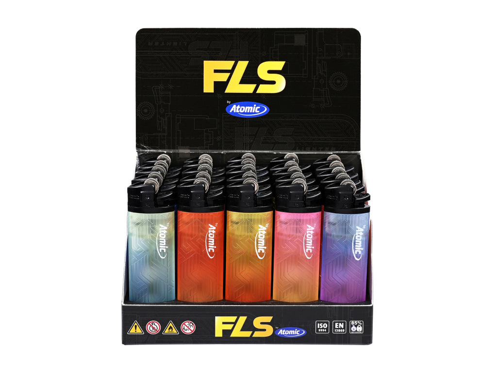 L’accendino Atomic FLS è un pratico modello usa e getta, disponibile in 5 colori assortiti con eleganti sfumature e finitura semi-trasparente dal look moderno. Ogni accendino è decorato con un motivo geometrico e il logo FLS, rendendolo accattivante e facilmente riconoscibile.