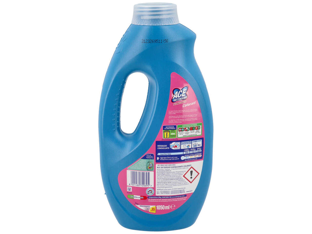 Ace detersivo igienizzante colorati 1050 ml. la nuova formula di ace detersivo, grazie a nuove tecnologie pulenti, è ancora più efficace nella rimozione di macchie e sporco, anche a freddo. ace detersivo, unito all'azione meccanica del lavaggio, igienizza il bucato rimuovendo germi e batteri, per un bucato fresco e pulito. le fragranze di ace detersivo, realizzate da grandi maestri profumieri, donano al tuo bucato una sensazione d'irresistibile freschezza che dura a lungo.