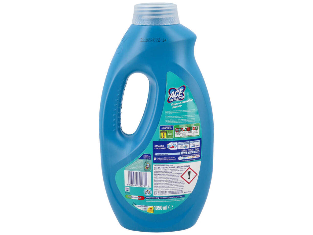 Ace detersivo talco e muschio bianco 1050 ml. la nuova formula di ace detersivo, grazie a nuove tecnologie pulenti, è ancora più efficace nella rimozione di macchie e sporco, anche a freddo. ace detersivo, unito all'azione meccanica del lavaggio, igienizza il bucato rimuovendo germi e batteri, per un bucato fresco e pulito. da oggi ace detersivo è anche nella nuova e iconica fragranza talco e muschio bianco, realizzata da grandi maestri profumieri, la sua freschezza morbida e raffinata avvolgerà  i tuoi capi a lungo.