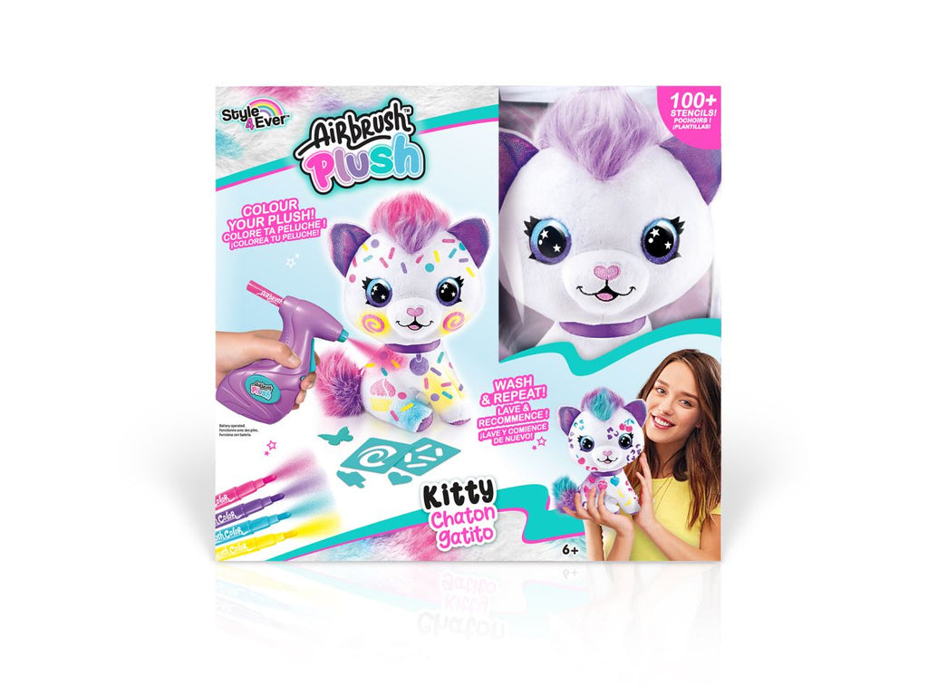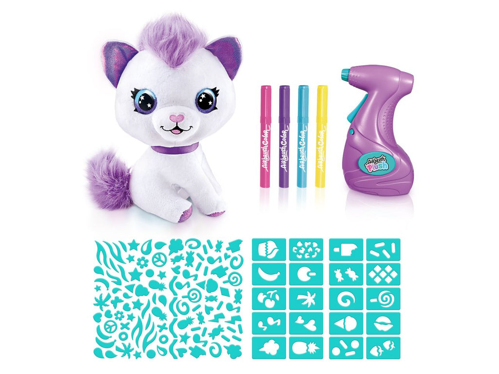 Airbrush plush gattino un dolcissimo gattino da personalizzare secondo il proprio stile! la confezione contiene tutto l'occorrente per sbizzarrirsi in decorazioni uniche e originali: ottieni un effetto strepitoso con l'aerografo elettrico, i pennarelli colorati e gli oltre 100 stencil inclusi! il peluche è interamente lavabile e può essere decorato e personalizzato infinite volte.