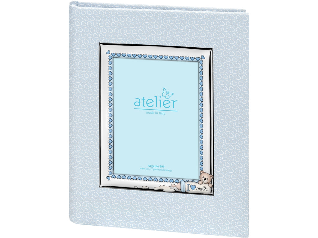 Album con cornice portofoto in argento celeste bomboniera nascita bambino, similpelle e argento con cuori, biberon e orsetto, stile kids per nascita e battesimo - 20x25 cm, portafoto 9x13 cm - Atelier