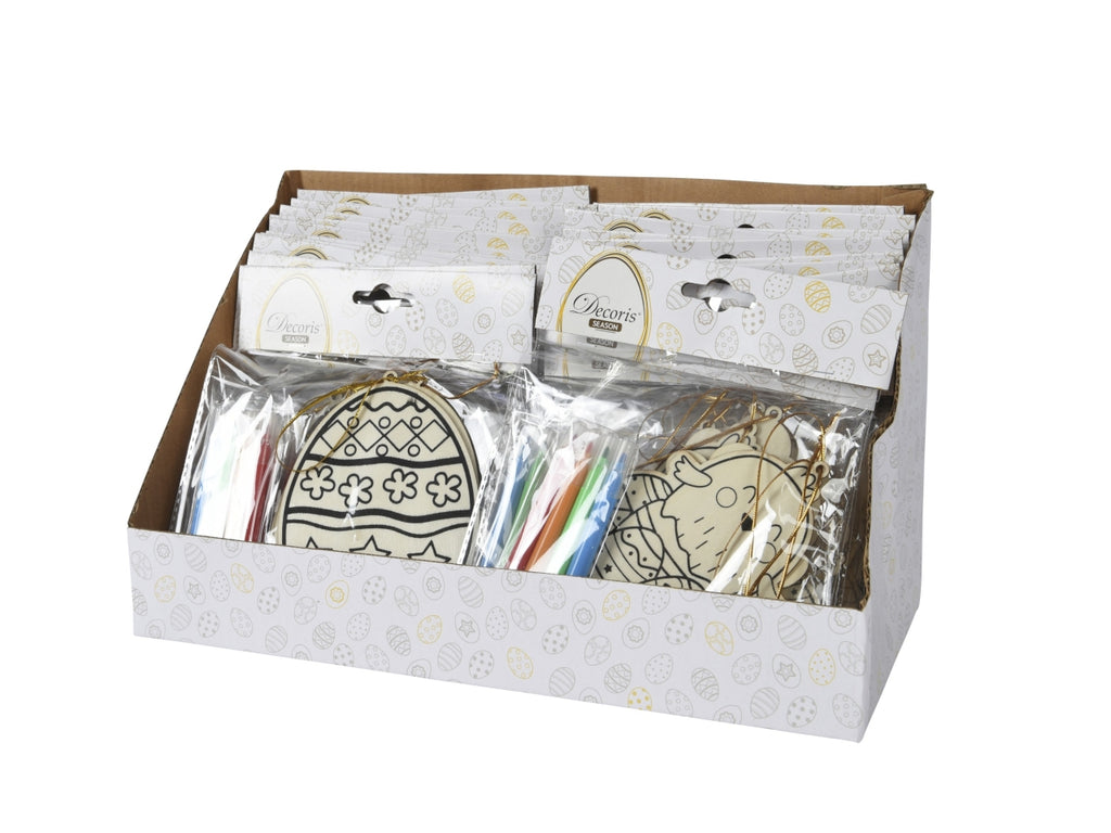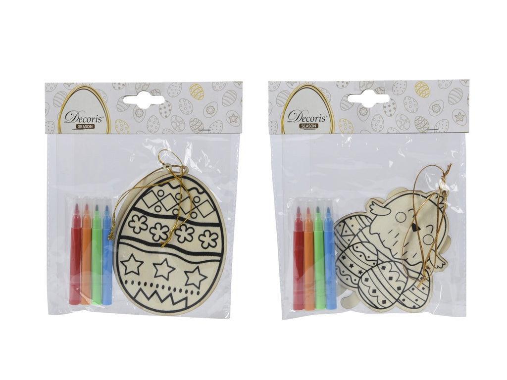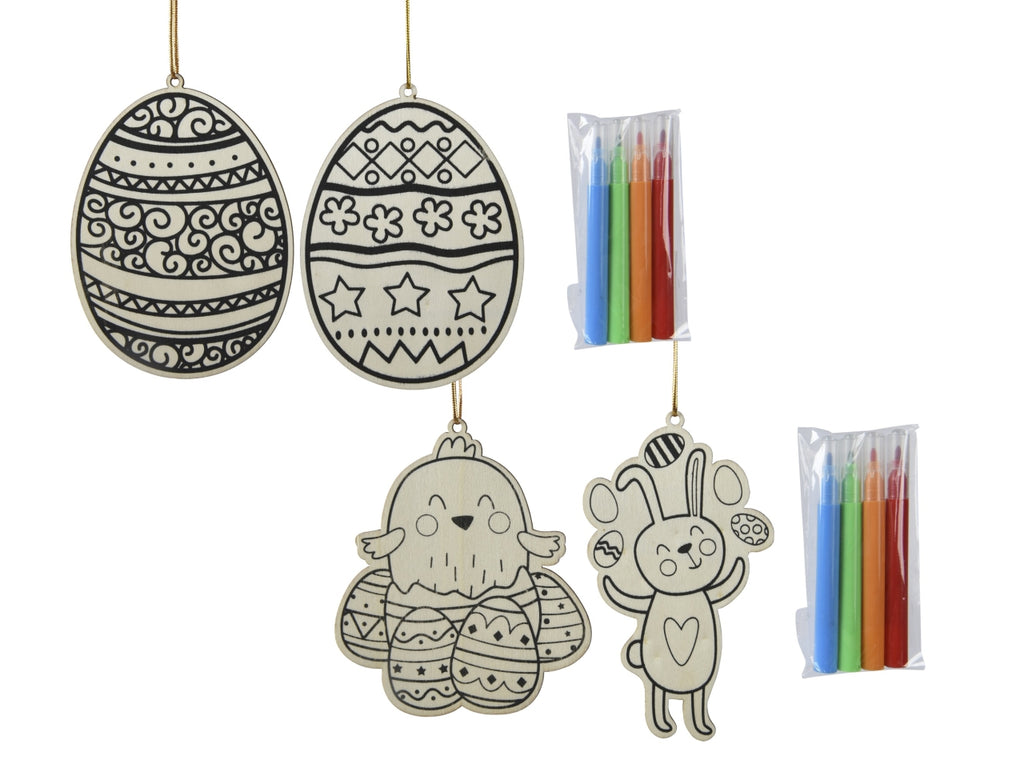 Porta una calda atmosfera primaverile nella tua casa con questo vivace set di decorazioni da appendere di Decoris. Questa allegra decorazione è composta da un uovo di Pasqua, una gallina e un coniglietto dalle forme organiche, realizzati in MDF leggero. Grazie al colore marrone naturale combinato con vari pennarelli colorati in verde, rosso e blu, puoi dare a queste decorazioni primaverili il tuo tocco personale. Ogni decorazione è dotata di un cordino metallico, che le rende facili ed eleganti da appendere in interni o in esterni.