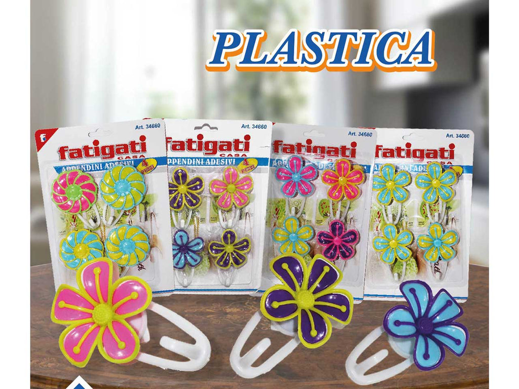 Ganci adesivi in plastica, multicolore, a forma di fiore, blisterati.