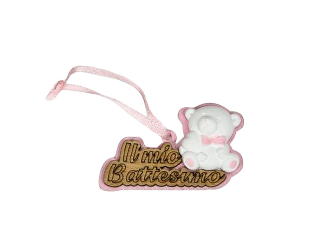 Applicazione legno orsetto battesimo l. misura 5,5cm rosa