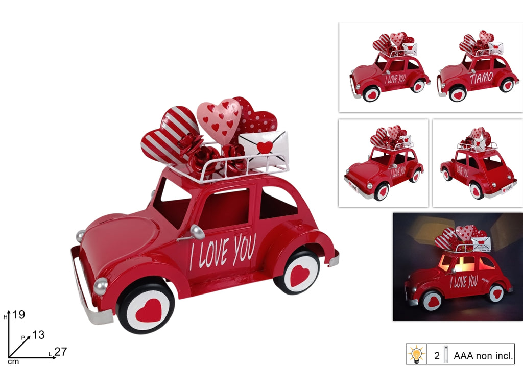 Auto in latta con decorazione san valentino e luce in 2 assortimenti