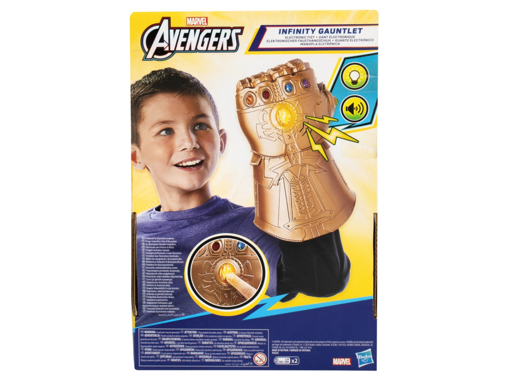 I bambini e le bambine possono immaginare di essere Thanos e di affrontare gli Avengers in epiche battaglie! Indossando il Guanto dell'Infinito Elettronico, potranno fingere di evocare il potere delle gemme. Premi il pulsante al centro per attivare luci ed effetti sonori entusiasmanti! Con i giocattoli Marvel Avengers: Infinity War, i bambini e le bambine possono immaginare di combattere come i propri eroi preferiti e di svolgere il proprio ruolo per salvare (o distruggere) la galassia! Ispirato al film "Avengers: Infinity War" della Marvel, il Guanto dell'Infinito è progettato per adattarsi alle dimensioni della maggior parte delle mani dei più piccoli. Grazie ai giochi per roleplay Marvel, bambini e bambine dai 5 anni in su vestono i panni dei loro supereroi preferiti e immaginano di salvare il mondo!