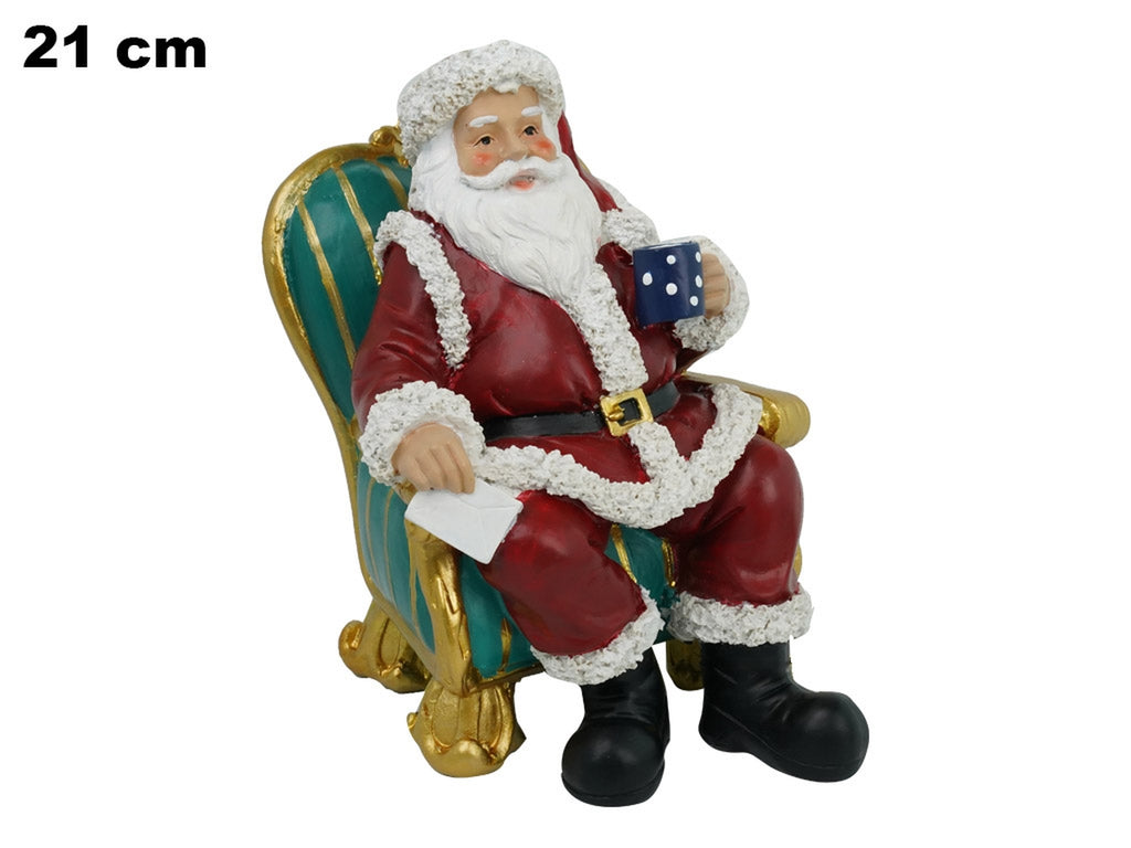 Babbo Natale seduto su una poltrona, alta 21 cm. Babbo Natale è vestito con il classico abito rosso bordato di pelliccia bianca e tiene una tazza blu a pois bianchi in una mano, mentre nell'altra ha una lettera. La poltrona è di colore verde con dettagli dorati, dando un tocco elegante e festoso alla scena. Questa statuetta decorativa è ideale per aggiungere un tocco di allegria e spirito natalizio a qualsiasi ambiente durante le festività .