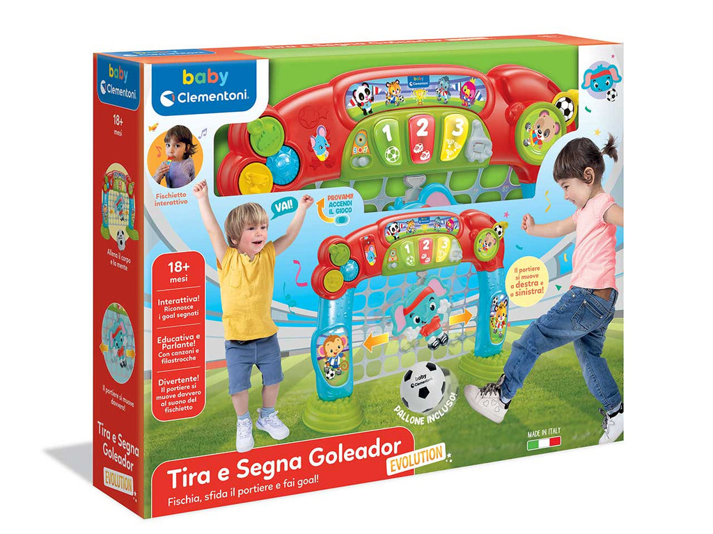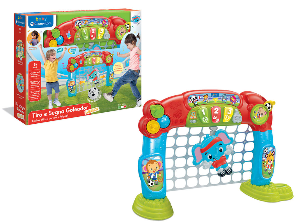 Tira e segna goleador evolution 2022 una colorata porta calcio che è anche un centro attività  per divertirsi in movimento e imparare in modo naturale! i piccoli potranno provare i primi tiri a porta vuota o aggiungere il portiere interattivo per rendere il gioco ancora più avvincente e realistico. suoni, voce ed effetti luminosi per catturare l'attenzione del bambino e guidarlo nel gioco, ma anche attività  meccaniche per sviluppare la motricità  fine, la coordinazione e le capacità  cognitive. la passione del calcio attira non solo i piccoli, ma anche i grandi: questo gioco diventa così una perfetta esperienza di condivisione tra genitori e figli. la porta riconosce i goal segnati aiutando il bambino ad imparare così i primi numeri. con 3 tasti colorati e luminosi che attivano canzoncine in rima per guidare il bambino in esperienze di gioco coinvolgenti e interattive attraverso stimoli sempre nuovi.