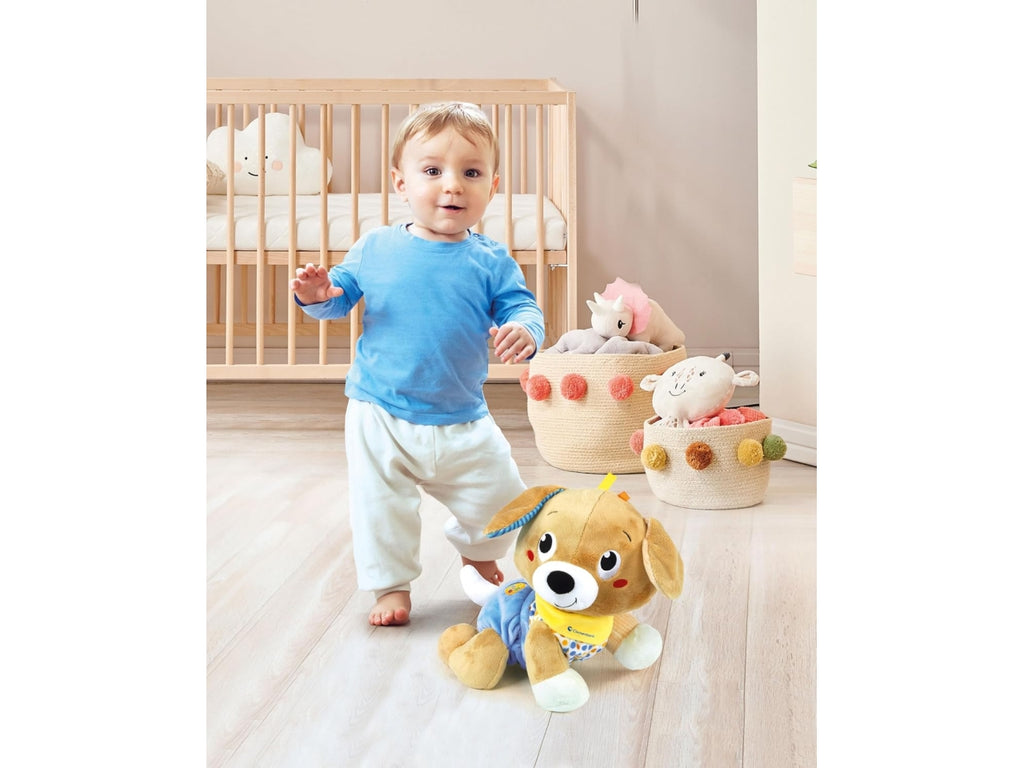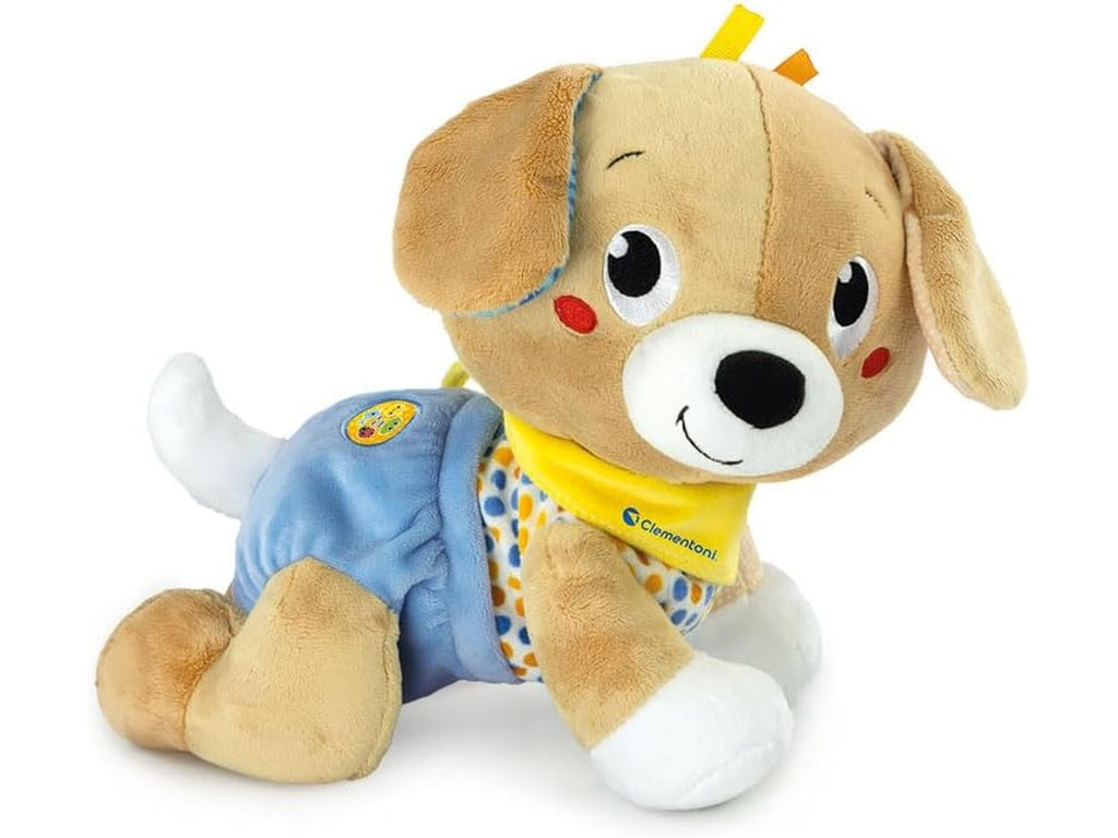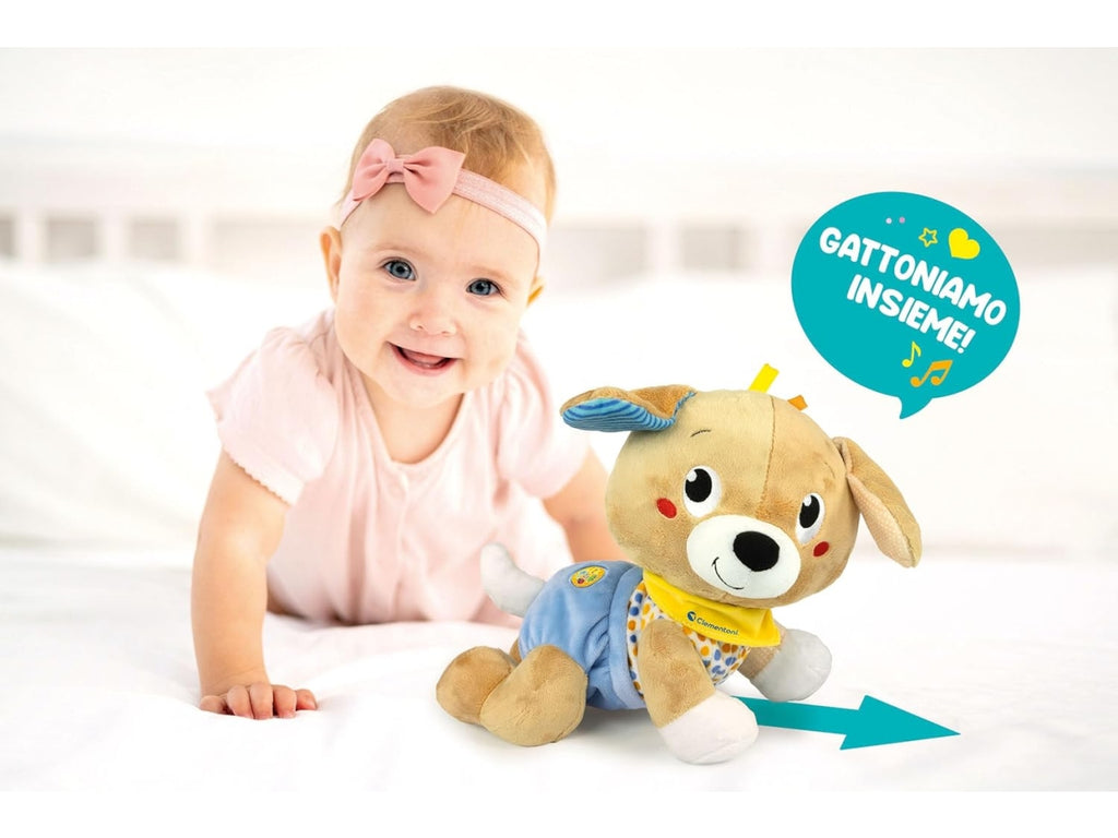 Un cagnolino per imparare a gattonare! Con pulsanti interattivi e contenuti educativi. Il morbidissimo peluche muovendosi nello spazio incentiverà il bambino a seguirlo per iniziare a gattonare. Stimola la motricità e l'attenzione. Realizzato con tessuti morbidi, resistenti e atossici.