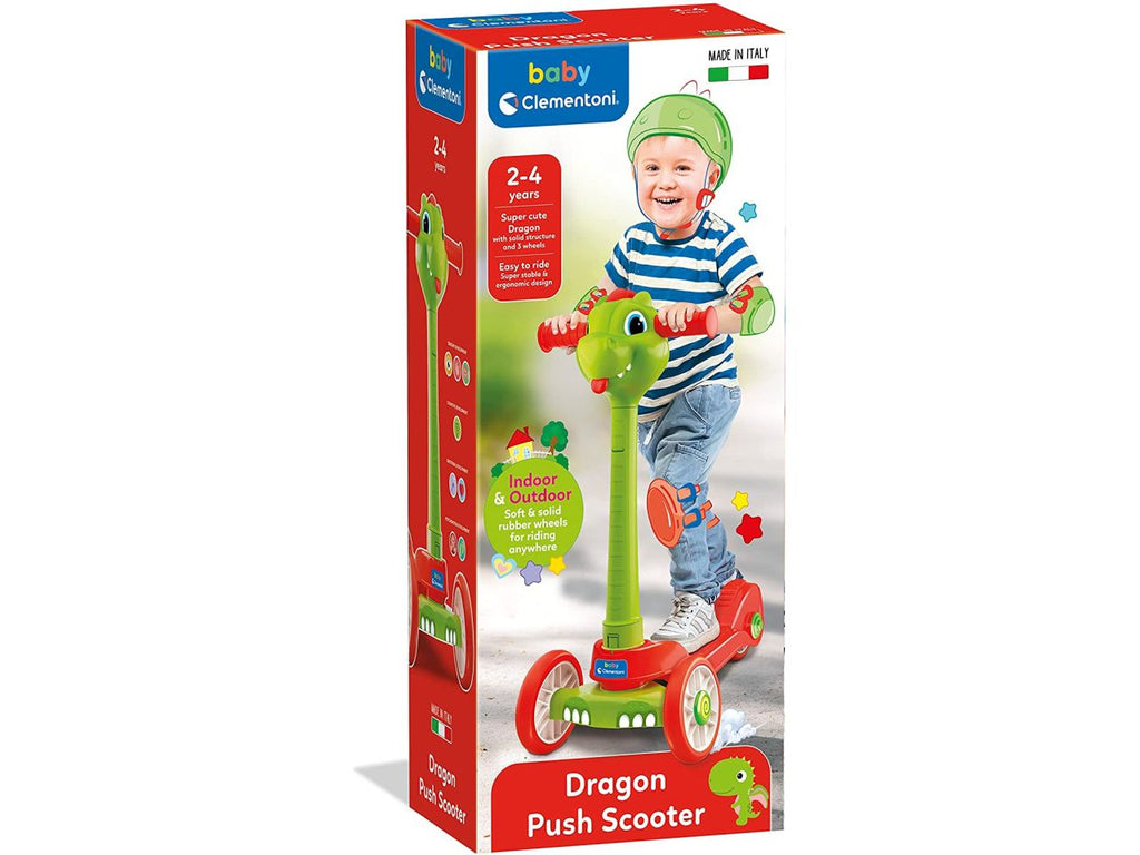 Clementoni- baby dragon push scooter-monopattino bambino 2 anni con 3 ruote, gioco da esterno ed interno-made in italy, multicolore.monopattino bambino: un simpatico draghetto monopattino, pensato per accompagnare i piccoli verso incredibili avventure!descrizione: colorato e divertente, questo draghetto è un ottimo alleato per divertirsi in totale sicurezzacaratteristiche: perfetto per giocare dentro e fuori casa, grazie alle ruote in gomma e alla maneggevole ed ergonomica struttura. 100% made in italymonopattino 3 ruote: le 3 ruote favoriscono una maggiore stabilità  , il telaio robusto e le maniglie in gomma morbida lo rendono un monopattino ideale anche per i bambini più piccoliaree di sviluppo: studiato per lo sviluppo psicomotorio, cognitivo, sensoriale ed emotivo; consigliato a partire dai 2 anni. Un simpatico draghetto monopattino, pensato appositamente per i più piccoli per accompagnarli verso incredibili avventure!