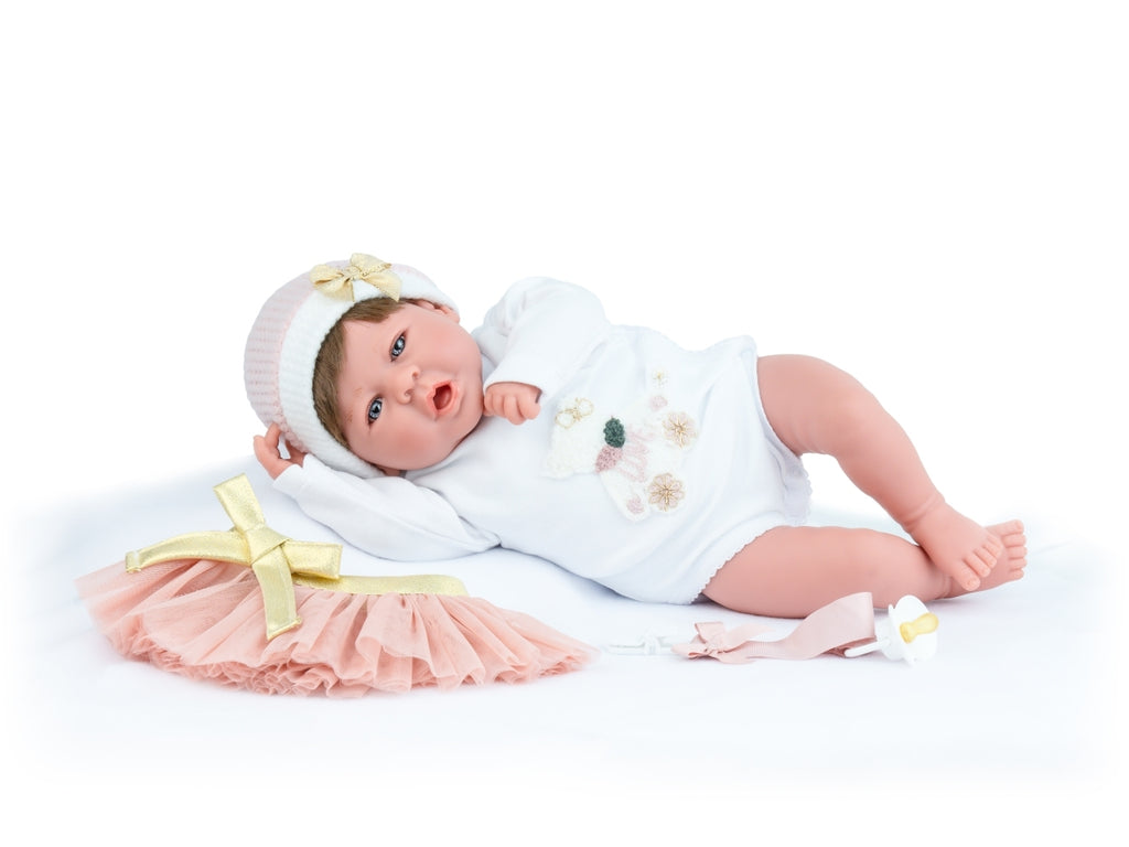 Bambola reborn femmina di 45 cm interamente realizzata in Spagna con materiali di alta qualità . à realizzato artigianalmente con dettagli molto realistici come il peso (1.700 kg)e gli arrossamenti, muco e bava. à articolata, adotta le posture di un bambino. Vestita con un grazioso body con un cappello di lana e una gonna di tulle. Include ciuccio e certificato di nascita. Presentata in scatola. Consigliato dai 3 anni in su.