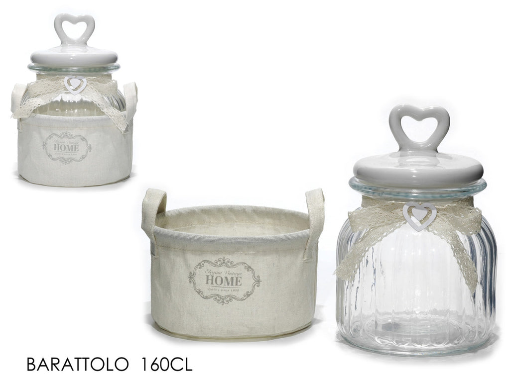 Questo barattolo da 160 cl unisce funzionalità ed eleganza, realizzato in vetro con un tappo in ceramica di colore panna. Accompagnato da un raffinato cestino in poliestere e cotone, si distingue per le sue dimensioni di 21 cm di altezza e 16,5 cm di diametro. Ideale per conservare alimenti o decorare la cucina, il barattolo e il coperchio sono lavabili in lavastoviglie, garantendo praticità senza rinunciare allo stile.