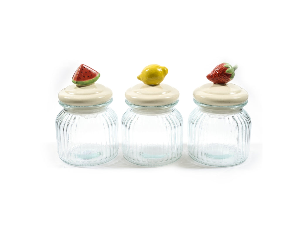 Barattolo ermetico frutta in vetro 650ml d. 11xh.17cm decori assortiti