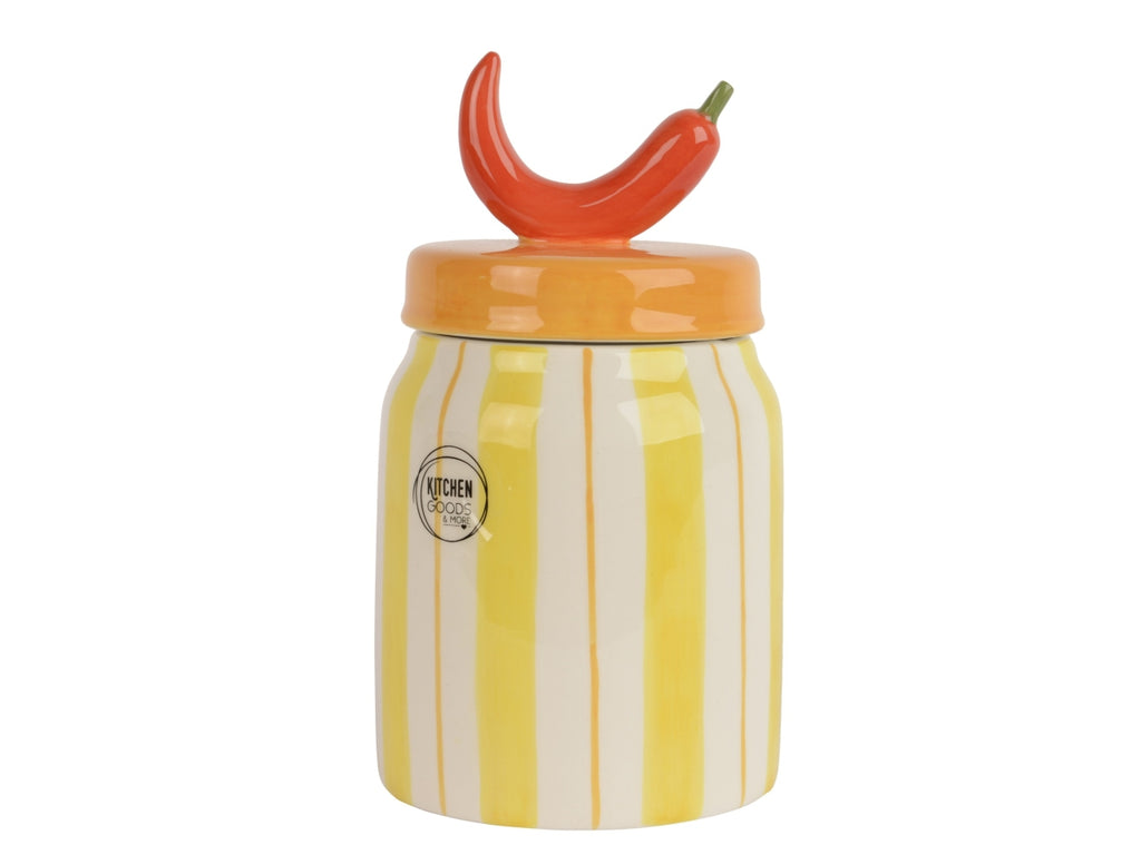 Aggiungi un tocco giocoso e colorato alla tua cucina con questo barattolo Kitchen Goods. Il barattolo in Dolomite presenta un vivace design a righe in calde tonalità multicolore e un esclusivo coperchio sormontato da un peperone rosso lucido come manico. Le sue dimensioni compatte, con un'altezza di 17,6 cm e un diametro di 10 cm, si adattano perfettamente al tuo piano di lavoro o alla tua mensola. Il design accattivante a forma di pasta conferisce un'atmosfera allegra e autentica a qualsiasi interno.