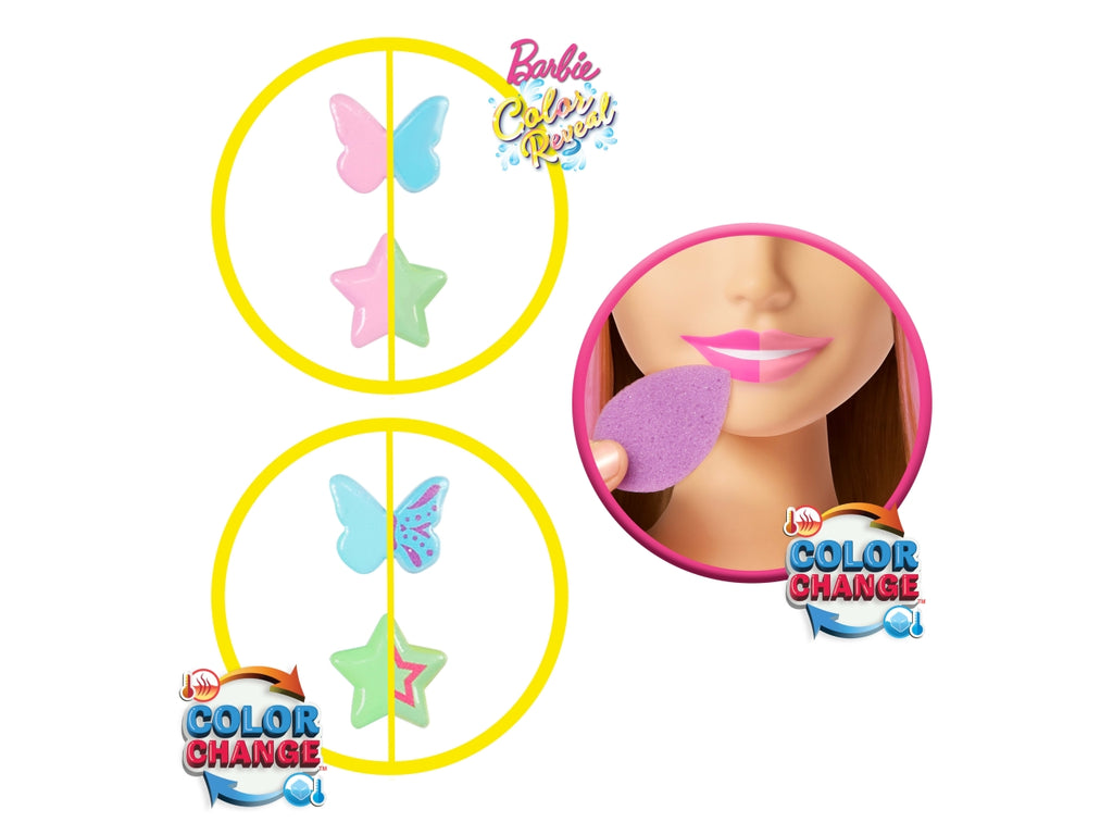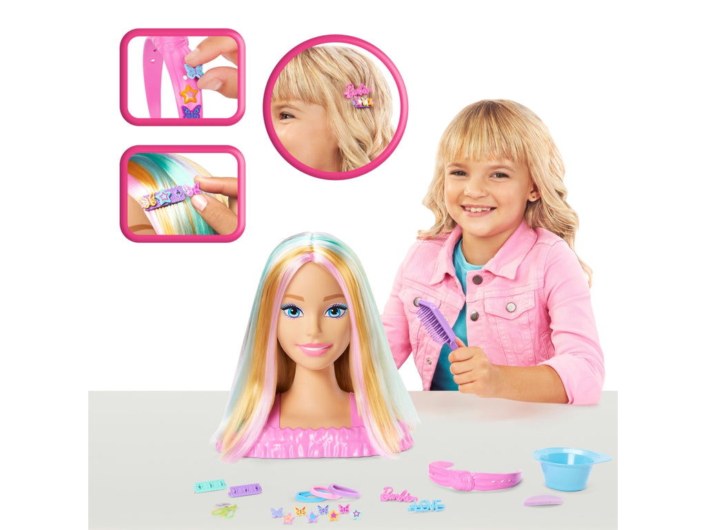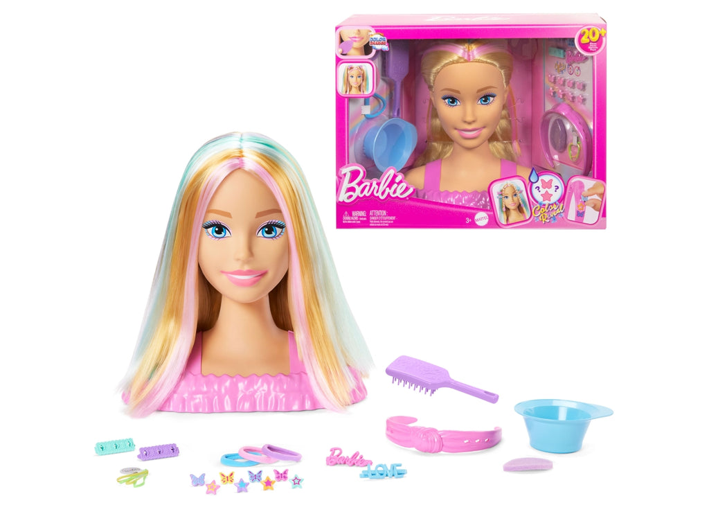 Diventa un parrucchiere esperto con la colorata testa pettinabile di Barbie! Barbie ha capelli biondi con ciocche rosa pastello, arancioni e turchesi! Utilizza la ciotola e la spugna incluse per dare il via alla magia cambia colore, così i capelli colorati di Barbie saranno abbinati ai suoi fermagli. Gli altri accessori colorati, come la spazzola per capelli, gli elastici e le mollette, aiutano i bambini a realizzare fantastiche creazioni! Queste bambole sono un regalo fantastico per bambini e bambine dai 3 anni in su.