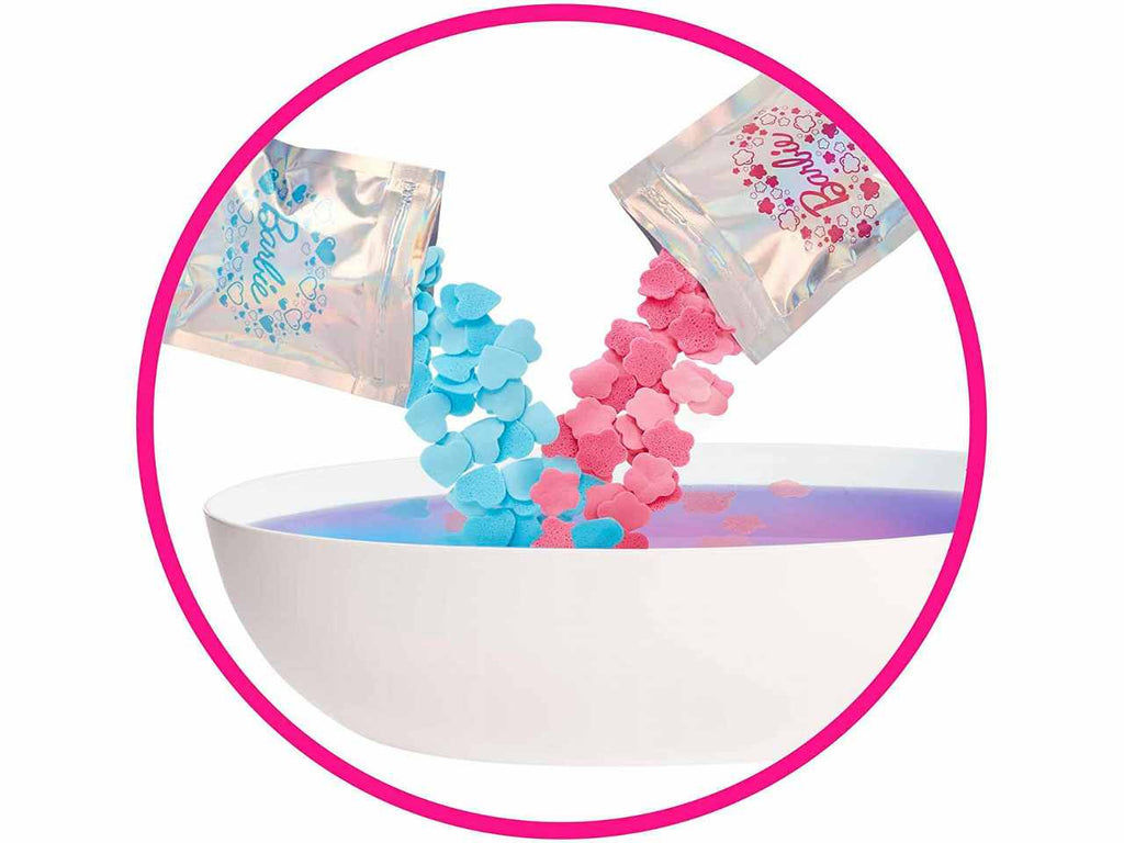 Cosa c'è di più rilassante di un bel bagno? Il Playset Vasca da Bagno Relax con bambola è il modo preferito di ricaricarsi, e il più colorato, per Barbie! Barbie è dotata di 7 articolazioni per infinite possibilità di pose realistiche. Ha capelli biondi lisci e indossa un costume da bagno con pareo trasparente! Include due bustine di coriandoli di sapone (rosa e blu) che cambiano il colore dell'acqua della vasca da bagno... che magia! Le bustine sono richiudibili per uso futuro. Ci sono abbastanza coriandoli di sapone per rigiocare. I bambini possono liberare tutta la loro creatività e provare a combinare le due bustine per creare far diventare l'acqua viola! Barbie ha tutto il necessario per un bagno rilassante: vasca e ripiano da bagno, ripiani, asciugamano, spazzola grande, spazzola piccola, lozione, sapone, pianta, candela, cartello e cagnolino. Questi accessori variegati creano la scena ideale per una narrazione fantasiosa! Inoltre, i ripiani e il porta-oggetti sono entrambi dotati di design attacca-e-stacca per una maggiore resistenza. Scopri un mondo di relax con un bel bagno! I bambini dai 3 anni in su possono collezionare altri playset e bambole Barbie per divertirsi ed esplorare il mondo del benessere!