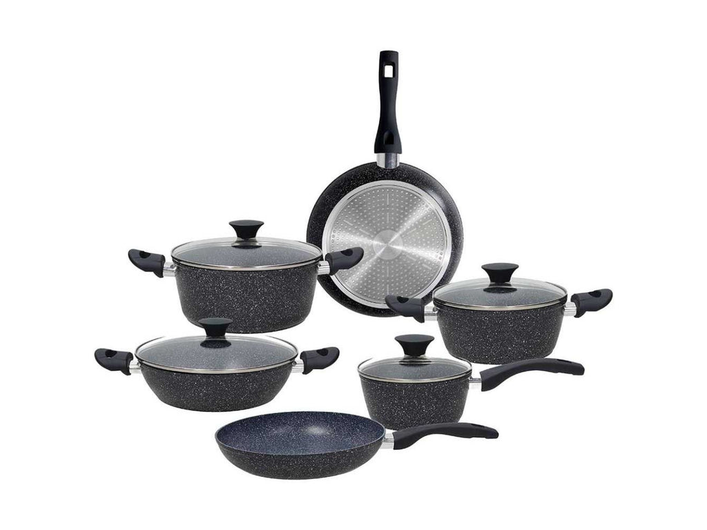 La linea di pentole e padelle Black Gemstone dal colore nero pesenta diversi set di varie misure per qualsiasi preparazione, per ottimi e preziosi risultati in cucina. La batteria di pentole e padelle 10 pezzi Balck Gemstone ha un corpo in alluminio forgiato che permette una distribuzione uniforme del calore; ha un fondo ad alto spessore che la rende versatile e robusta, e adatta ad ogni piano di cottura, compresa l'induzione; il suo rivestimento esterno effetto granito resiste alle alte temperature e i manici con finitura soft touch sono stati realizzati per garantire una presa salda e sicura antiscottatura; il rivestimento interno è antiaderente rinforzato a 4 strati. La batteria di pentole e padelle Black Gemstone è Nickel free e PFOA free ed è idonea al lavaggio in lavastoviglie.
