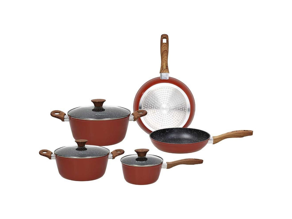 La batteria di pentole e padelle 8 pezzi Rustic Stone, dal design vintage rivisitato in chiave moderna color rosso mattone, è il set perfetto per il tuo quotidiano tra i fornelli, completo e versatile per qualsiasi preparazione. Il corpo è in alluminio forgiato, e il fondo ad alto spessore è adatto a tutti i piani di cottura, compresa l'induzione. Il rivestimento interno effetto pietra è antiaderente rinforzato a 4 strati, per una cucina sana e salutare senza l'aggiunta di grassi, e i manici sono soft touch effetto legno. Nickel free e PFOA free la batteria di pentole e padelle Rustic Stone è inoltre lavabile in lavastoviglie.