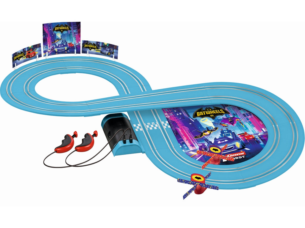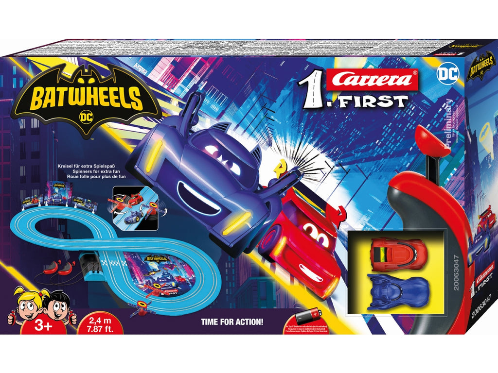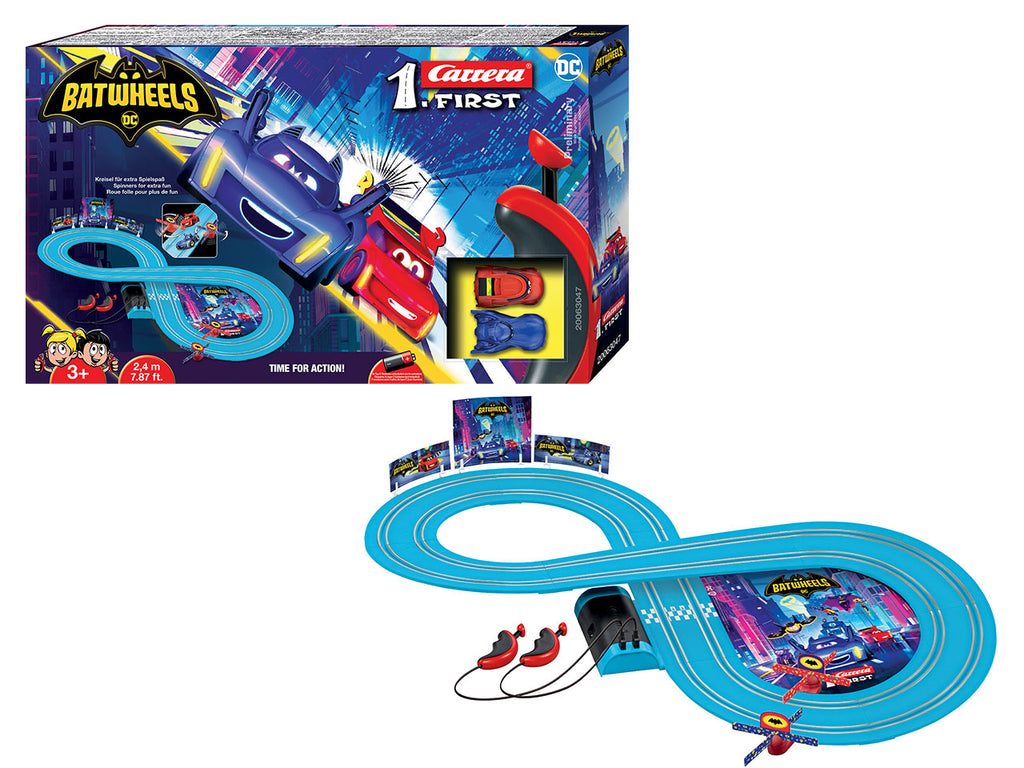 Le Batwheels di Gotham prendono d'assalto la serie Carrera FIRST Il set Carrera FIRST "Batwheels - Time for Action" è la pista di gioco definitiva per i giovani amanti dell'avventura dai 3 anni in su! L'auto di Batman entra in azione nella serie Batwheels. "Bam" è l'abbreviazione di Batmobile. L'intero team di supporto del veicolo supereroe superpotente di Gotham combatte la battaglia contro il crimine. Anche Bat e il suo amico Redbird, l'auto di Robin, si uniscono all'azione sulla pista Carrera FIRST. Le due piccole supercar in scala 1:50 corrono sulla pista blu brillante da 2,4 metri nel set "Batwheels Time for Action". Le trottole garantiscono ulteriore divertimento durante il gioco. Il set di piste è un regalo perfetto per garantire ai piloti in erba innumerevoli ore di divertimento.