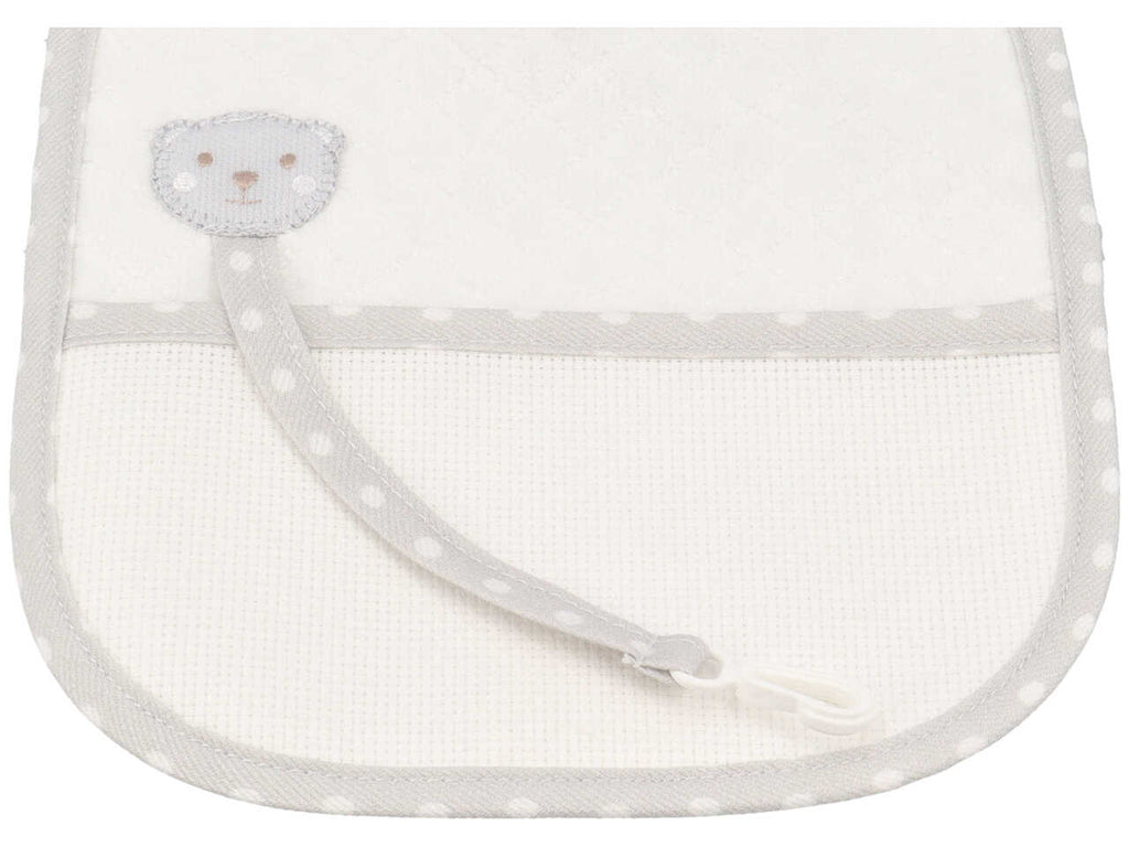 - Altre specifiche con gancio portaciuccio con inserto in tela aida per ricamo