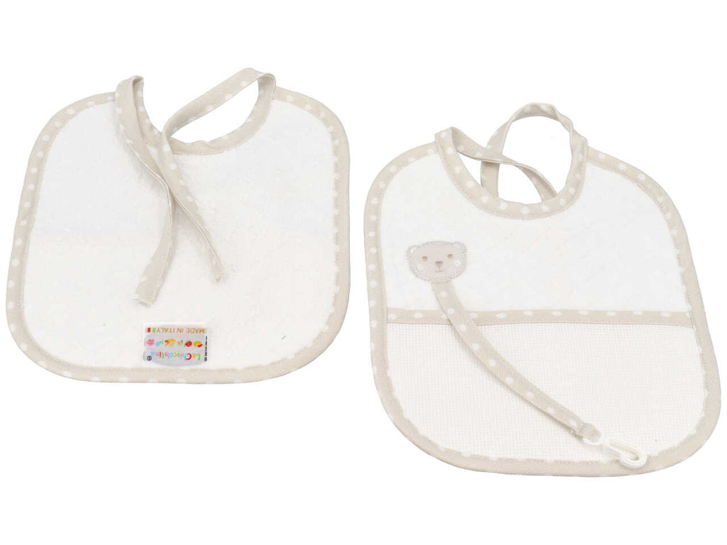 - Altre specifiche con gancio portaciuccio con inserto in tela aida per ricamo