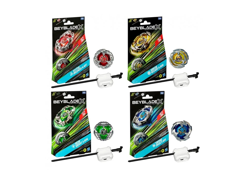 Scoprite la nuova generazione Beyblade X, con lo Starter Pack che include 1 trottola e 1 lanciatore (per giocare è necessario il Battle Set o il Beystadium, venduti separatamente). Lanciati subito in battaglia o riconfigura la lama, il cricchetto e la punta intercambiabili della trottola con quelli di altre trottole Beyblade X (vendute separatamente), per creare la tua Bey personale e insuperabile. Beyblade X è dotata dell'innovazione X-Celerator Gear System, per aumentare il livello del gioco e la velocità delle Bey.