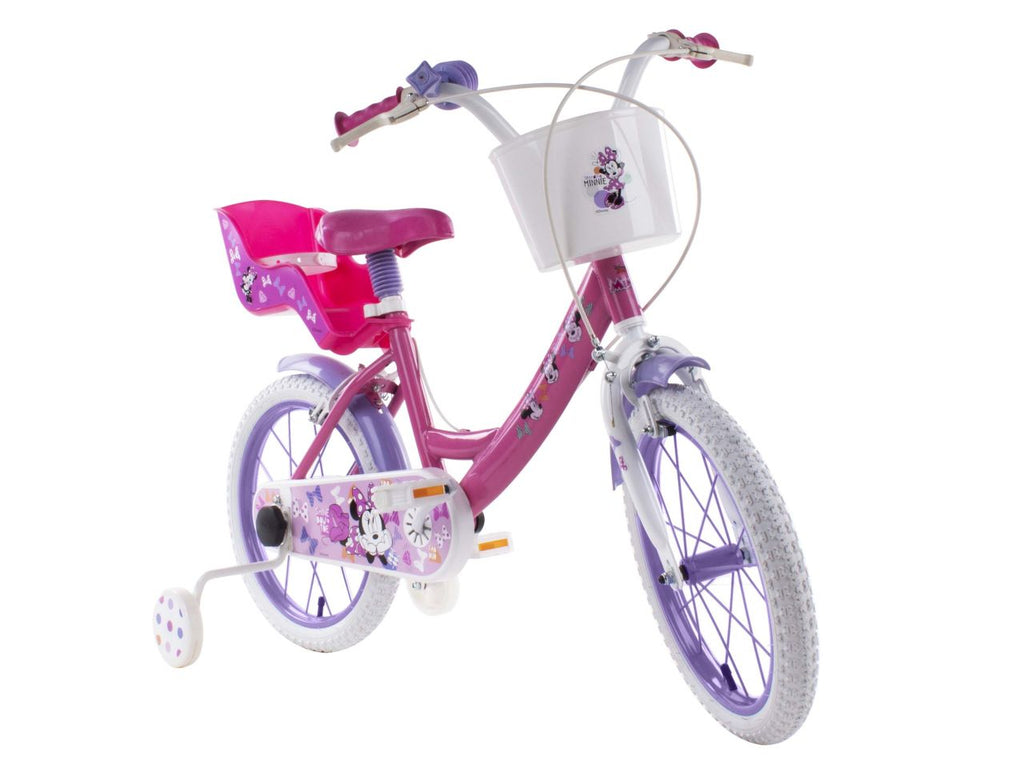 Bicicletta 14" telaio in metallo, cerchi in metallo con raggi in metallo, coperture e camera gonfiabile, ruota libera, 2 freni caliper, cuscinetti in nylon, parafanghi deluxe, rotelle security plus con personaggio, cestino anteriore, trombetta, portabambola, componenti in plastica rinforzati.