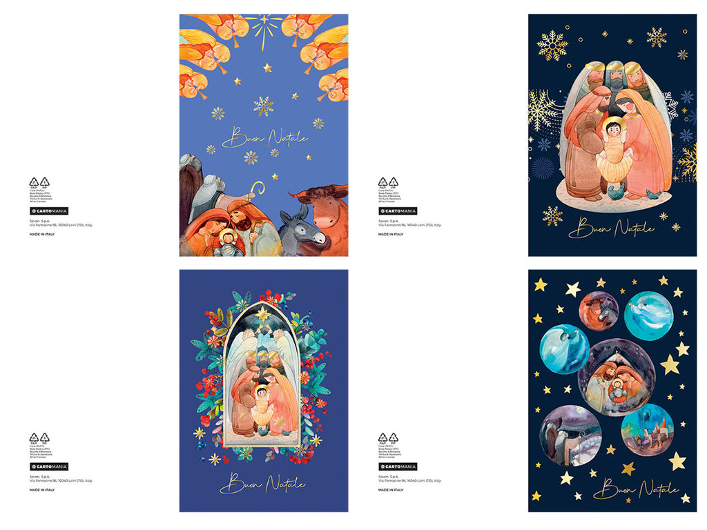 Biglietti formato 11,8x16,8 cm in carta goffrata con foil oro e busta color panna. Confezionati singolarmente.