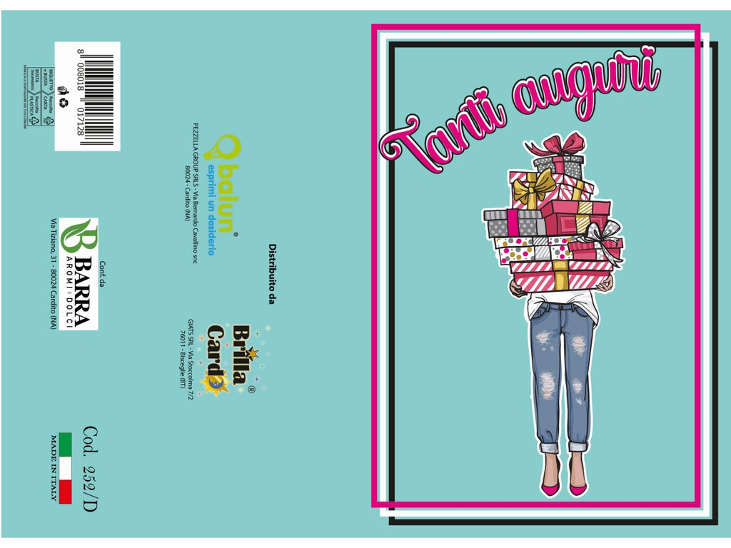 Biglietto Auguri generico ragazza con pacchi "TANTI AUGURI". Laminato fucsia