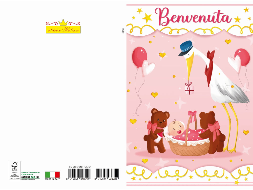 Uno sfondo delicato e rosa con palloncini a forma di cuore e limmagine di una cicogna tenera accanto a due orsetti affettuosi. Al centro, cè un cestino rosa con una dolce bimba. In alto, in caratteri giocosi, Benvenuta