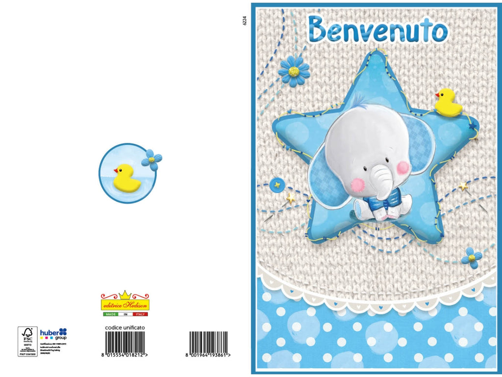 Uno sfondo delicato con una stella azzurra in stoffa. Affacciato dalla stella, cè un tenero elefantino con un papillon blu, simbolo di fortuna e dolcezza. In alto, in caratteri delicati, si legge: Benvenuto!