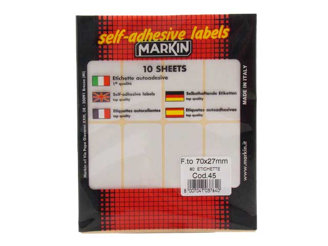 Etichette autoadesive confezionate in buste da 10 fogli, appendibili, in scatola da 25 buste Molti tuoi clienti cercano un modo di prezzare i propri prodotti in maniera veloce e pratica ? Offrigli la soluzione definitiva con la nostra etichetta adesiva multiuso 70x37mm. Creata e pensata per lesposizione del prezzo, il suo adesivo posteriore risulta impeccabile su qualsiasi tipo di superficie, rimanendo ben saldo senza staccarsi anche dopo molto tempo. Implementa da subito nel tuo magazzino prodotti il nostro set di fogli adesivi etichette per i negozi di cartolibreria e cancelleria !