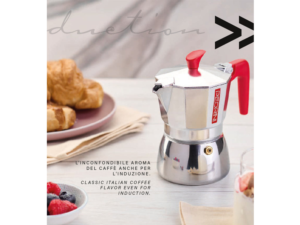 La tradizione si rinnova nell'iconica moka dal manico rosso. L'icona senza tempo si reinventa per incontrare le esigenze del tempo: la moka Pedrini, famosa per il rosso del manico e del pomolo è ora disponibile anche per gli amanti dei piani ad induzione. Il contenitore sfaccettato riprende il classico design Pedrini, mentre la caldaia in bimateriale, brevetto esclusivo, combina l'alluminio interno per preservare l'aroma originale del caffè e l'acciaio esterno per la compatibilità con l'induzione. Un perfetto equilibrio tra tradizione e modernità, per un caffè che sa di casa, ovunque tu sia.