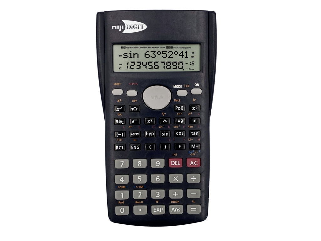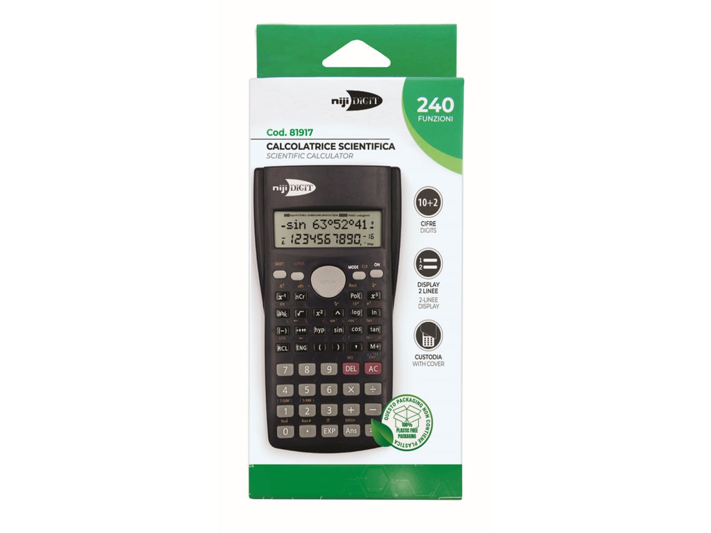 Calcolatrice scientifica 10+2 cifre, 240 funzioni con custodia. Impugnatura ergonomica e scatola appendibile. Calcoli aritmici di base, deviazione standard calcoli di regressione, funzione replay, conversione decimale, calcoli con gradi, minuti e secondi, funzioni trigonometriche e iperboliche.Tasti in plastica, display a 2 linee, calcoli statistici e logaritmici, batteria inclusa, auto spegnimento. Calcolatrice avanzata in grado di gestire percentuali, calcoli matematici ed elaborazione dati.