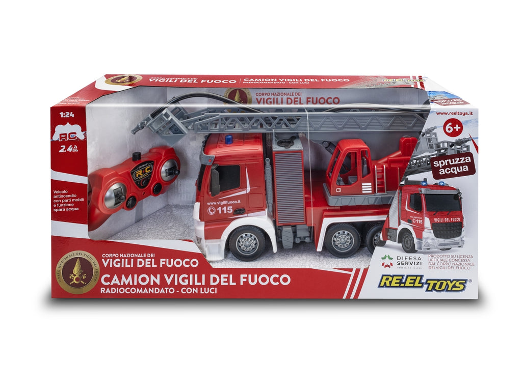 Camion vigili del fuoco: camion rc 2.4ghz. con luci, parti mobili e funzione "spara acqua" azionabile dal trasmettitore. batteria al litio ricaricabile + cavo usb per la ricarica inclusi