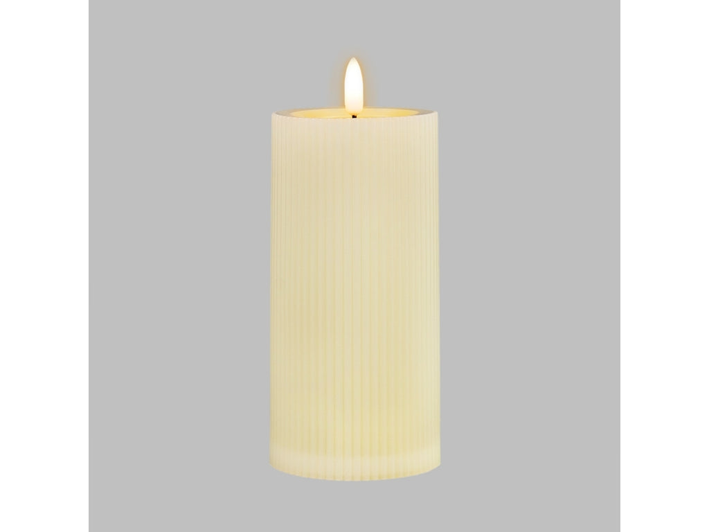 Candela Cilindrica IN-OUT 3DF a Coste RIBBED Ø7,5cm H15cm Glossy Plastic Wax Avorio AVORY in Plastica effetto cera finitura lucida, 3D Wick Flame LED BIANCO CALDO, Fiamma 3D con stoppino ed effetto cera sciolta Melted Wax, Timer giornaliero 8 ore On (16 ore Off) disattivabile, Interruttore Timer-Off-On sotto la base, a Batteria 2xAA, Waterproof uso Interno Esterno Portatile, Sleeve color card (XKC Art. COY 75B-150K T).