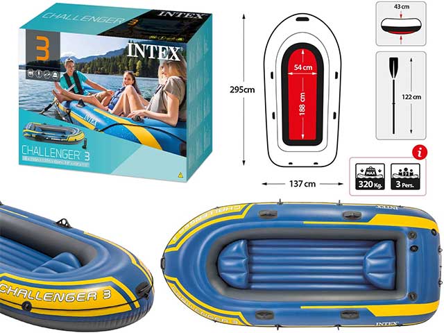 Challenger 3 set. resistente e durevole grazie al pvc superstrong, potrai vivere le tue avventure in acqua senza paura di impatti e abrasioni. le tre camere daria separate con valvole boston e il fondo gonfiabile i-beam ti garantiranno maggiore stabilità  e comodità  . design essenziale e affusolato dai grintosi colori blu e giallo. capacità  3 persone. peso massimo supportato 320 kg