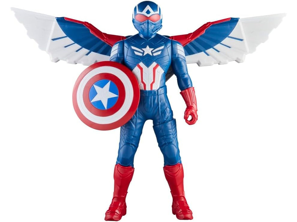 Giocattolo Marvel da 22 cm: immaginate l'azione e l'avventura con questa statuetta Captain America: coraggioso New World da 22,9 cm, con splendide ali pop-out, casco rimovibile e accessorio per scudo.
