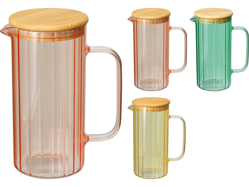 Caraffa in vetro borosilicato con manico, 900 ml/30,51 oz, 90 x 190 mm, design a coste, 3 colori fiori assortiti, verde, rosa, giallo, con coperchio in bambù e anello in silicone.
