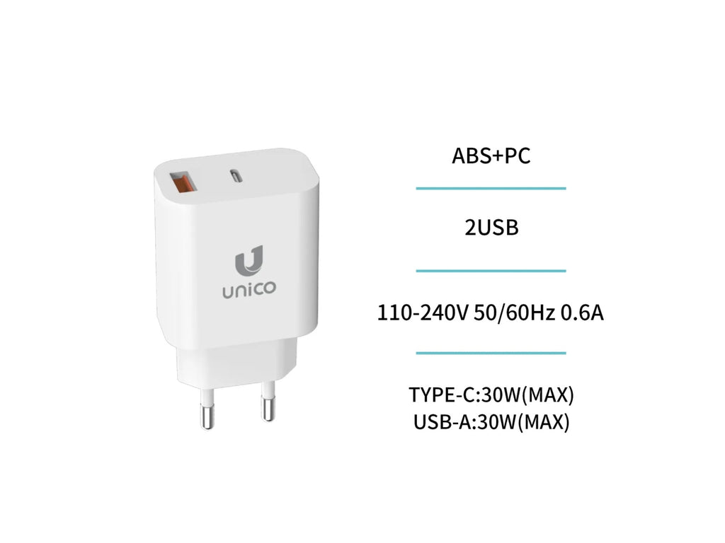 Caricatore Viaggio 2 Porte Type-C, 2 porte USB, potenza di uscita massima singola USB 30 W, materiale PC ignifugo V0, chip intelligente, sicuro e senza preoccupazioni, ricarica rapida, sicura ed efficiente, durevole, conversione ad alta efficienza.
