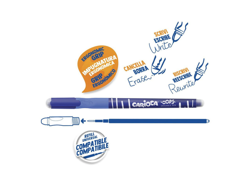 Penne cancellabili oops - 6 pz.penne cancellabili oops con inchiostro termosensibile. impugnatura ergonomica triangolare con doppia gomma. punta di ã 0,7 mm. colori assortiti. doppia gomma. refill compatibili