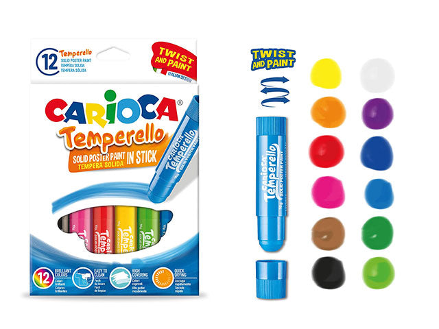 Tempera solida in stick, colori brillanti lavabili ad alta coprenza, senza solventi, mescolabili tra loro, asciuga rapidamente, non ondula la carta, non necessita di vernice protettiva, finitura satinata, utilizzabili su carta, cartone, legno e cartoncino, multieffetto: premendo poco si ottiene effetto cera, premendo più forte si ottiene tempera, mischiando con acqua e pennello si ottiene effetto acquerello, italian design