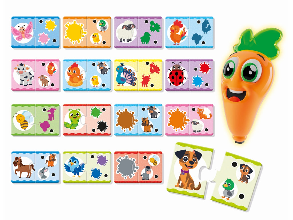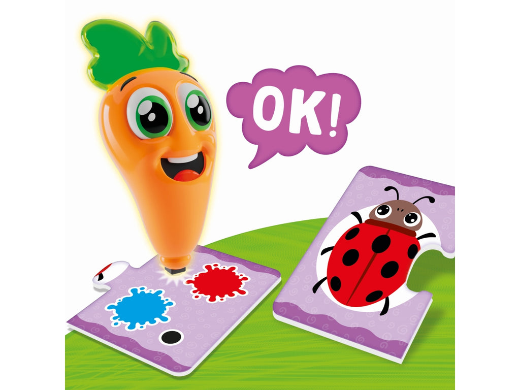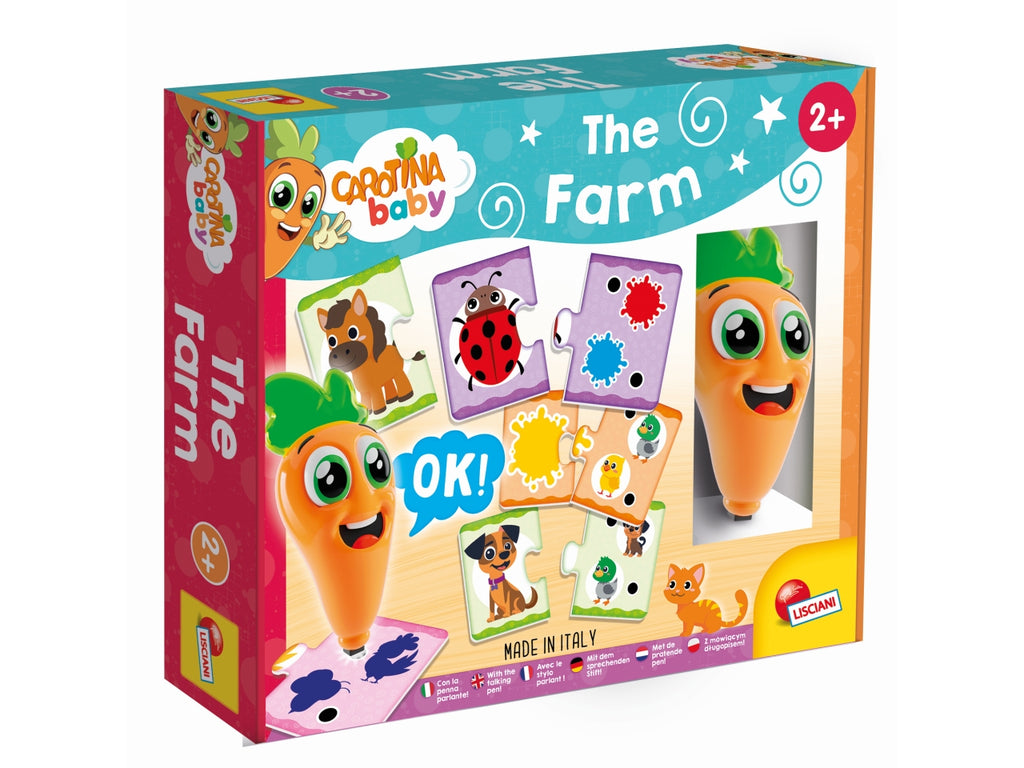 La Baby Carotina penna parlante, guida il bambino alla scoperta di una colorata fattoria! Tanti quiz interattivi per conoscere animali, colori e tanto altro!