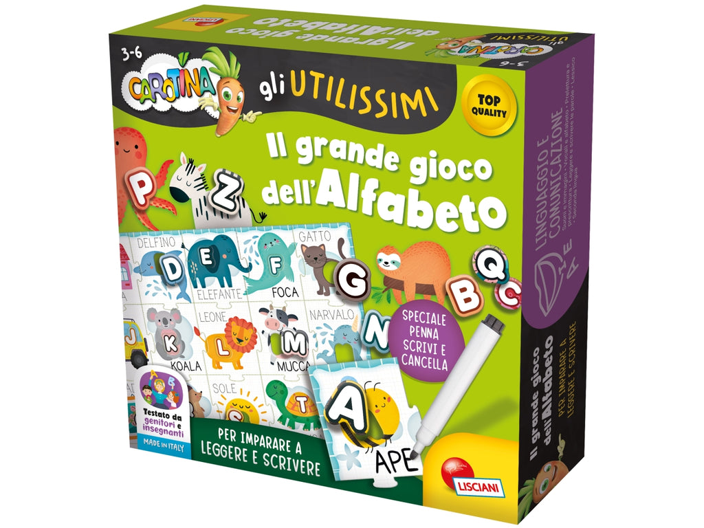 Un grande alfabetiere scrivi e cancella per insegnare lettere e parole. Con attività a incastro e di ricalco, permette di imparare in modo semplice e divertente.