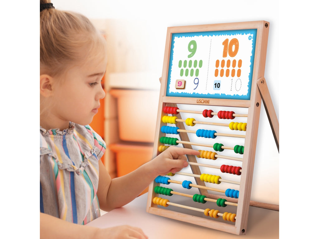 Il tradizionale abaco in legno diventa uno strumento efficace per insegnare al bambino la logica e i primi calcoli. Inoltre, la lavagna scrivi e cancella permette di scrivere e riscrivere ogni volta che si vuole. E sul retro, la classica lavagna gesso per disegnare!