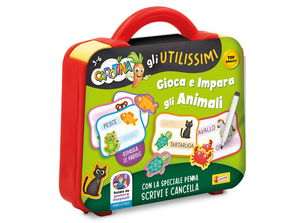 La speciale valigetta di Carotina ti consente di portare questo gioco sempre con te! Tante attività perscoprire gli animali . E poi, metti tutto in ordine nei pratici comparti della valigetta.