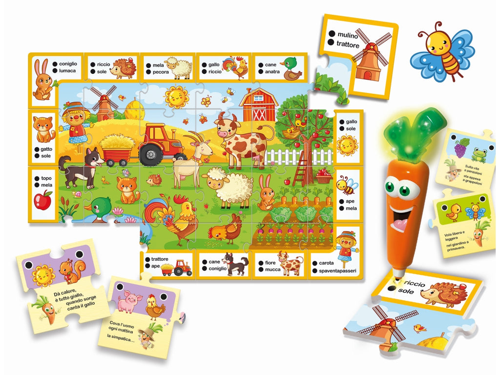 Un'allegra fattoria per giocare e imparare tante cose! Tanti quiz educativi per esercitare la logica e arricchire il lessico in compagnia della Carotina parlante e luminosa!