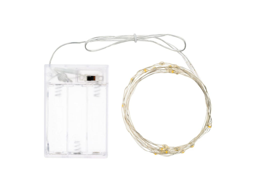 Catena lineare 2m 20 microled bianco ø1,5mm, versione pdq, luce fissa, a batteria 3xaa 1,5v, porta batterie con selettore on-off, ip20 uso interno e portatile, cavo metallo argento metal silver, dimensioni 2m, scatola pvc color ed espositore pdq try me (xkc art. m20s 3aa pdq).