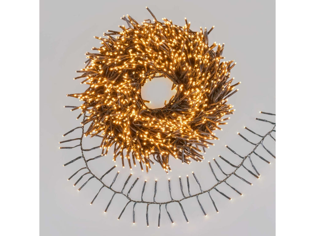 Catena Festone Cluster Ø10cm FSLG 15m 1000 MiniLED TRADITIONAL e BIANCO CALDO Ø3mm, Cavo Verde, gioco luce automatico FlashLED Diamond (900 led Traditional a luce fissa + 100 led B.Caldo con lampeggio veloce), Timer giornaliero 8 ore On (16 ore Off) disinseribile tramite Pulsante Luminoso integrato nel Trasformatore SELV di Sicurezza, IP44 uso Esterno e Interno, Cavo di Alimentazione 4m, Dimensioni 4+15m, Scatola lusso color (XKC Art. FSLG G 1000H 15M).